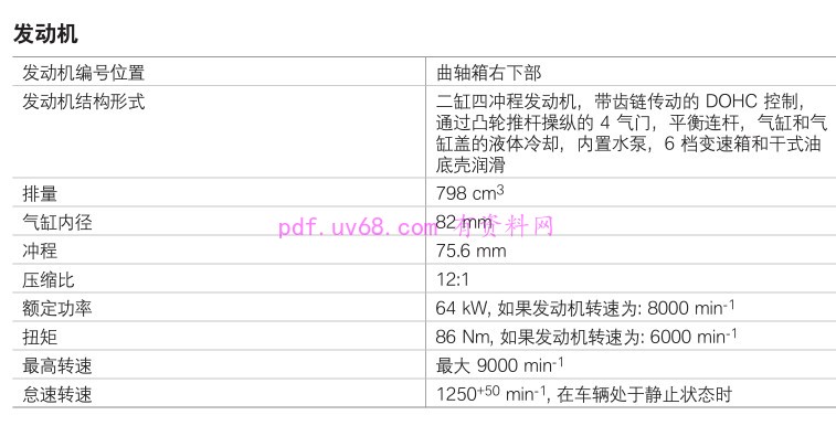 ----- 资料详情 ----- 资料预览:请看截图. 资料简介:PDF格式 (2013-11)出版 二缸四冲程发动机,带齿链传动的 DOHC 控制,通过凸轮推杆操纵的 4 气门,平衡连杆,气缸和气缸盖的液体冷却,内置水泵,6 档变速箱和干式油底壳润滑 本文网址:https://pdf.uv68.com/a/119.html 欢迎分享本文,分享时请保留出处! Time :01-31 3人喜欢 分享/收藏:喜欢的朋友,记得复制网址 收藏本文!