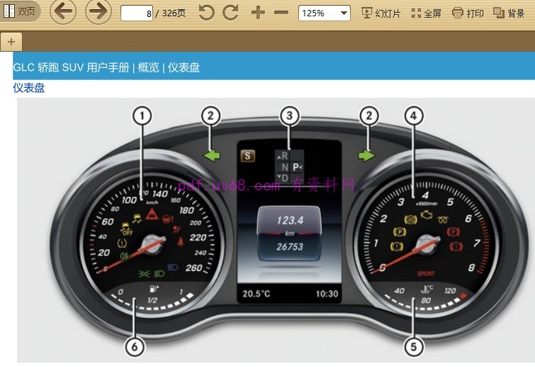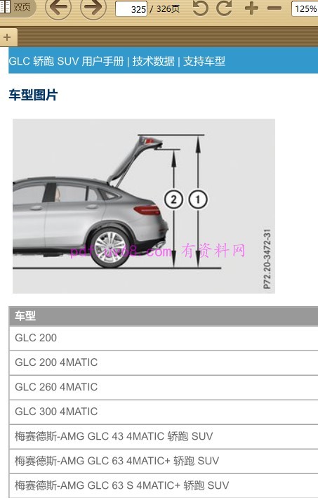 ----- 资料详情 ----- 资料预览:请看截图. 资料简介:PDF格式 可发邮箱 仪表按键操作说明 包括以下车型:GLC 轿跑 SUV GLC 200 GLC 200 4MATIC GLC 260 4MATIC GLC 300 4MATIC AMG GLC 43 4MATIC AMG GLC 63 S 4MATIC+ ★此手册为内部资料,仅供车主阅读使用。不建议打印,因为是A4的大小,打印时没页码的。★ 本文网址:https://pdf.uv68.com/a/36.html 欢迎分享本文,分享时请保留出处! Time :07-27 3人喜欢 分享/收藏:喜欢的朋友,记得复制网址 收藏本文!
